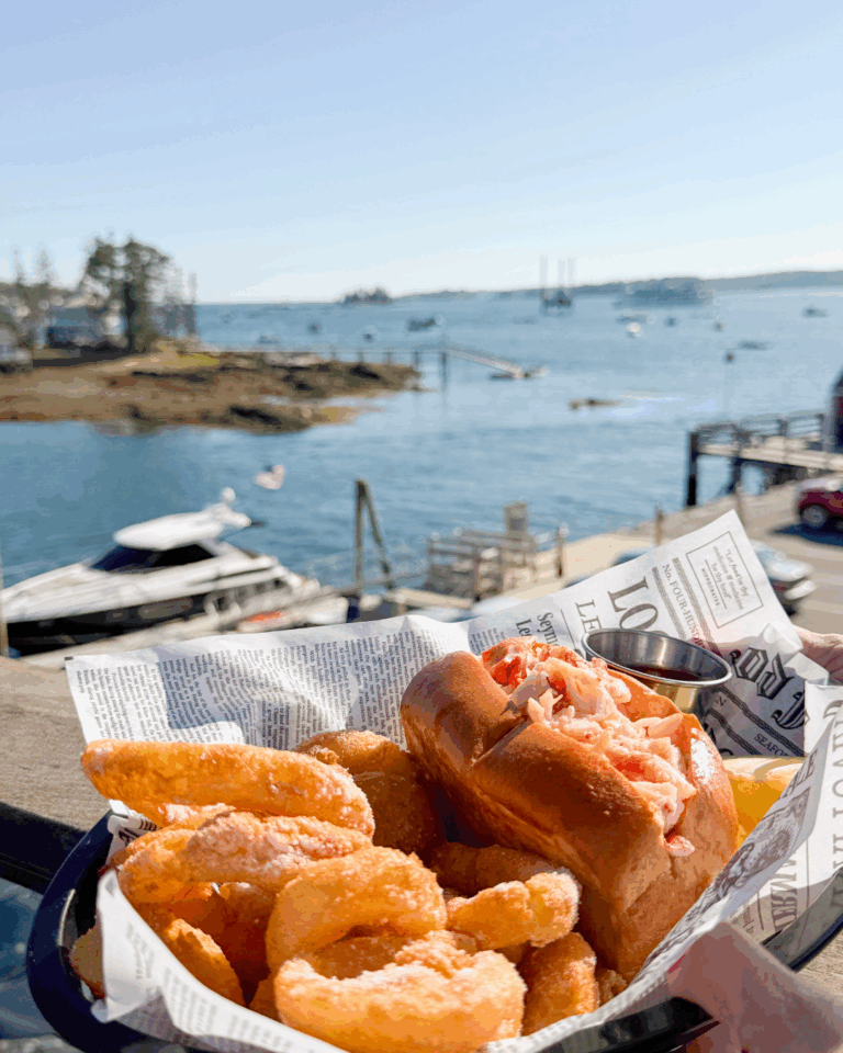 Tugboat Restaurant View & Maine Lobster Roll with Salt & Vinegar Onion Rings